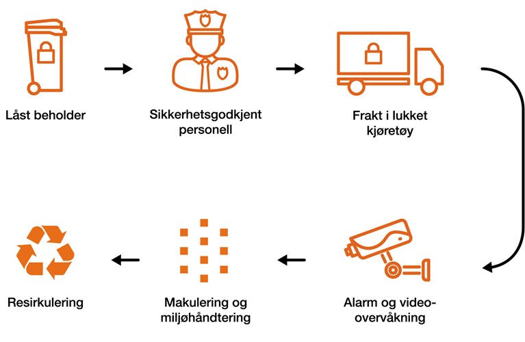 Innholdet i makuleringsbeholderen makuleres på godkjent anlegg med streng adgangskontroll og kvalitetssikrede rutiner. Alle lokaler har godkjent innbruddsalarm og videoovervåking tilknyttet en vaktsentral med uttrykning.